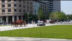 すると皇居の方から、パトカーに先導されて馬車がくるではありませんか。